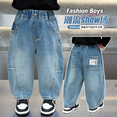 男童裤子春秋季新款潮酷儿童时髦柔软舒适韩版贴标弯刀牛仔裤